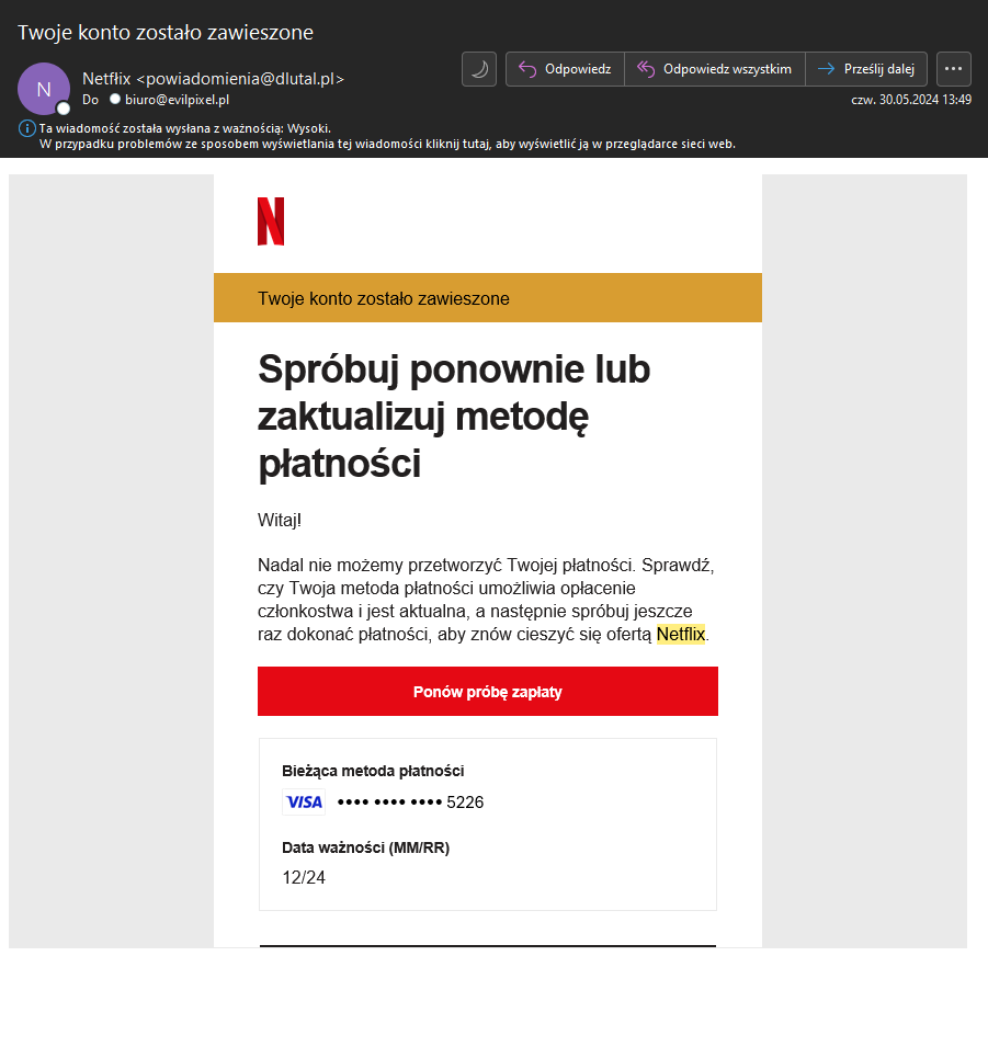 Baltazar otrzymał e-mail od znajomego, który prosi o pilne przelanie pieniędzy. Sprawdził adres nadawcy i wyglądał dziwnie. Jakie zagrożenie mogło mieć miejsce?