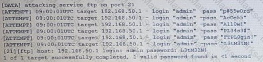 A security analyst is investigating what appears to be unauthorized access to a corporate web application. The security analyst reviews the web server logs and finds the following entries: [] Which of the following password attacks is taking place?