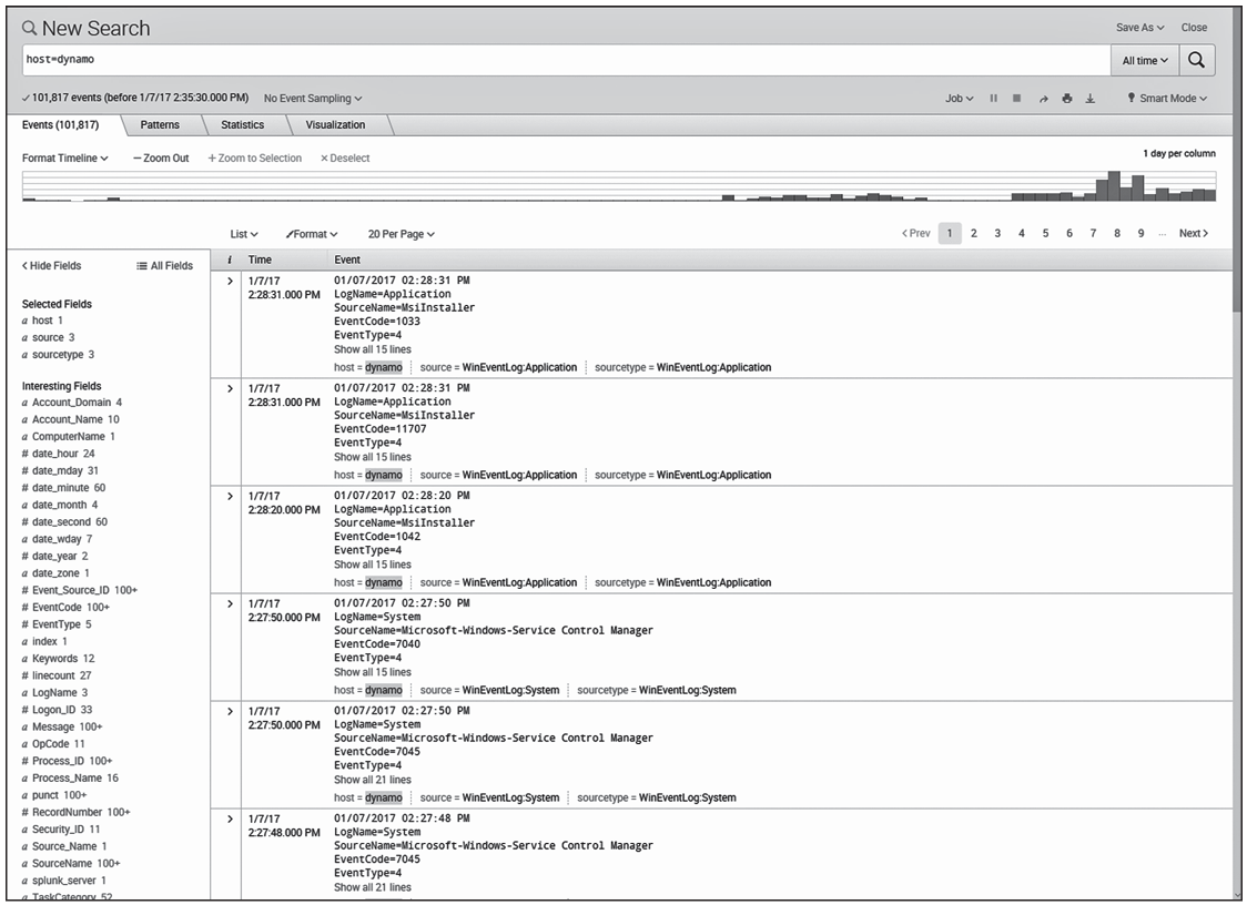 The interface shown in the picture is Splunk, a SIEM that specializes in visual search and allows analysts to comb through massive quantities of information in an intuitive way. Kiwi and other Syslog tools allow the collection and analysis of this information but do not provide the visual interface used in Splunk. Sysinternals does not include a log analysis tool.